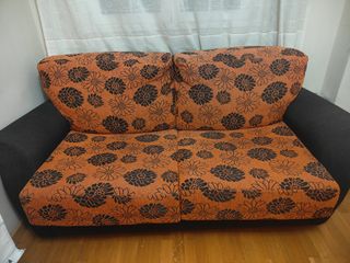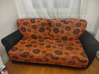 Sofá cama funcional con estructura resistente.tienes k lavar los cojines y limpiarlo x lo demás todo bien xk está sacado de una obra.de ahí su precio - Tapicería de tela. - Marco interior de metal. - Base de láminas de madera.