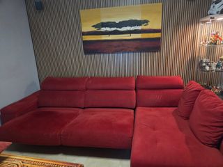 Sofá chaise longue (lado izquierdo) rojo 295 cm | 2 asientos extraíbles + cabeceros regulables + dos cojines tapizados a juego Muy cómodo y confortable, en buen estado. ✅ Asientos extraíbles/deslizantes: se sacan desplazándolos y queda tipo relax/cama. ✅ Cabeceros regulables en altura (reposacabezas abatibles y removibles con velcro). ✅ Módulos fácilmente separables para facilitar la limpieza y moverlo. Tapizado en tela tipo ante/microfibra. Estructura firme y robusta