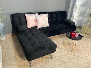 Este sofá cama de terciopelo negro es un mueble versátil y elegante para tu hogar. Incluye un puffs a juego. - Diseño capitoné. - Patas doradas. - Tapicería suave al tacto. - Disponible en 2 colores negro - azul MEDIDAS: Largo: 210 cm Ancho: 74 cm Alto: 82 cm Cama: 180x105 cm . Pago en casa . Entrega a domicilio llámanso al 66.7.9.6.3.13.6.