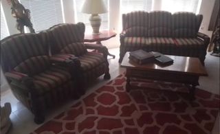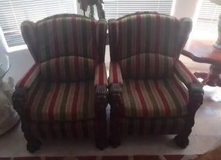 PRECIO POR todo 100€ Conjunto de muebles de estilo clásico compuesto por un sofá de dos plazas y dos sillones individuales. Son piezas elegantes y robustas, ideales para un ambiente acogedor. Teléfono WhatsApp 619827403 - Tapicería a rayas en tonos verdes y rojos. - Estructura de madera. - Patas con forma de garra.