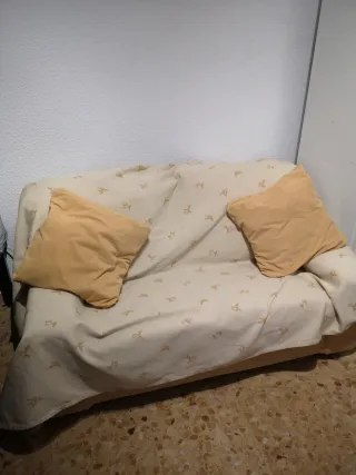 Sofá cama de tela en color beige, con una funda decorada con un patrón sutil y dos cojines a juego. Medidas 150cm largo x 100cm ancho. Cama de 90x1.80cm. - Funda con estampado. - Incluye dos cojines. - Material de tela. Escucho ofertas. Recoger en persona en Albacete capital.
