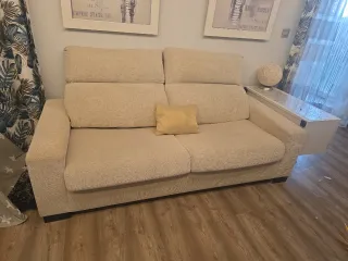 Vendo sofá de tres plazas muy cómodo y resistente. Tapizado en tela de tono marrón jaspeado, fácil de limpiar y con un diseño que combina con cualquier salón. Los cojines del respaldo y del asiento son mullidos y ofrecen muy buen apoyo. El sofá está en buen estado, ideal para casa, apartamento o piso de alquiler. Con los dos sillones el precio del sofa es de 100€