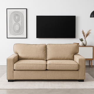 Sofá cama de tela en color beige, con un diseño moderno y elegante. Perfecto para aprovechar el espacio. - Medidas: 2 metros de largo. - Acolchado confortable.