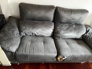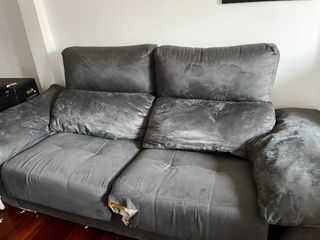 Cómodo sofá de tres plazas en color gris. Su tapicería de tela tipo terciopelo le da un toque elegante. - Diseño moderno. - Asientos amplios. - Respaldo alto para mayor comodidad. -se desmonta en 5 piezas - Tiene un desgarro en el frontal tapado con un cubre sofas es muy comodo -con los cojines abierto se hace cama