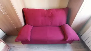 SE ENTREGA EN BURGOS EL DOMINGO 29 DE MARZO. Se puede llevar al domicilio por un precio extra negociable. Sofá cama de tela tipo antelina, suave, en color granate. - Diseño moderno y funcional. - Acolchado confortable para sentarse o dormir. - Ideal para espacios pequeños. - Colchón de 130cm.