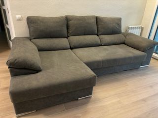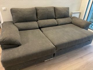 Sofá cama en color gris, ideal para espacios pequeños. Se encuentra en buen estado, aunque presenta algunas señales de uso. - Incluye chaise longue. Y tiene para almacenar. Los laterales tienen engachones por lo que se puede vender sin funda.