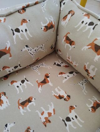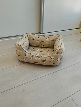 Cama acolchada con un divertido y original estampado de perros de diferentes razas. Usada, pero no mucho porque mi perrete sabe que se duerme mejor en el sofá. Está como nueva y recién lavada. Medidas exteriores: 45*37 Medidas interiores: 30*22