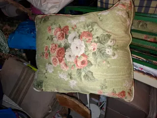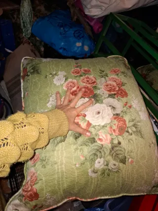 Cojínes decorativos con un bonito estampado floral. Con cremallera para poder lavarlos, relleno de plumas, perfectos para el suelo, o para sillón o sofá, para caravana, camping, camper, porche, jardín,son grandes 3 unidades disponibles, a 9e unidad o 25e los 3 Y 2 cojines de otro anuncio - Diseño con flores rosas y blancas sobre fondo verde. - Tejido suave al tacto. Necesitan limpieza