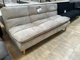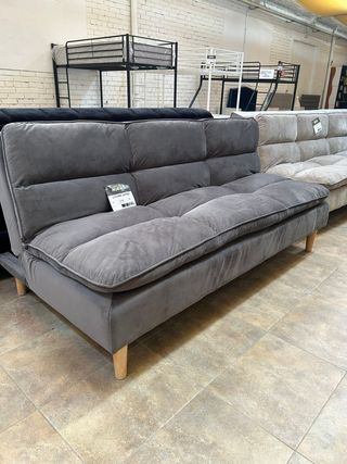 Sofá cama de tela gris, completamente nuevo y sin usar. Ha estado en zona de buhardilla sin usar. Tapicería de tela. Estructura de metal. En posición sofá la zona de asiento tiene ancho de 57 cm y el respaldo de 47 cm En posición cama tiene ancho de 108 cm y largo de 180 cm