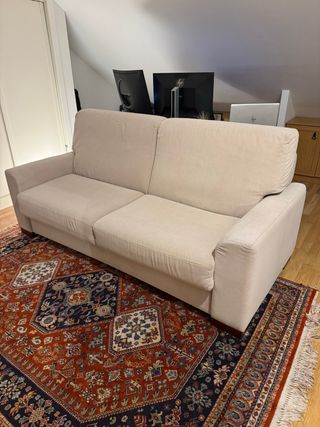 Vendo sofá cama de 3 plazas en color beige claro, muy cómodo y funcional. Se convierte fácilmente en cama mediante sistema abatible con estructura metálica resistente. Medidas aprox.: – Ancho total sofá: 200 cm – Fondo asiento: 53 cm – Largo cama abierta aprox. 183 cm – Ancho cama: aprox. 140 cm 🛏️ Incluye colchón viscolatex integrado, ideal para invitados o uso ocasional. 🪵 Patas de madera maciza. 🧼 La tapicería esta limpia de hace unos meses (ver fotos). Tiene una barra y una cremallera medio rota, pero no afecta al funcionamiento ni a la estética (foto5) 🚭 Casa sin humo. 📍 Recogida en mano por varias personas, pesa mucho.