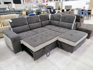 Sofá cama chaise longue de gran tamaño, perfecto para salones amplios. Su diseño moderno y funcional lo hace ideal para el día a día y para recibir visitas. - Medidas: 280x160cm. - Incluye espacio de almacenamiento. - Convertible en cama.