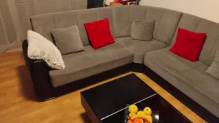 Se vende rinconera con sofá cama y puf a juego. Ideal para aprovechar el espacio. - Medidas: 260x160 cm. - Tapizado en tela. - Estructura de madera.
