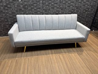 Sofá cama de estilo moderno y minimalista, perfecto para cualquier espacio. - Estructura de madera. - Tapicería de tela en tonos beige y blanco. - Cojines a juego incluidos. URGE VENDER , no negociable