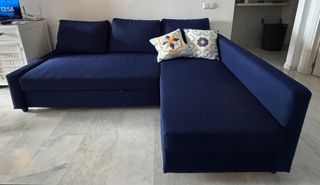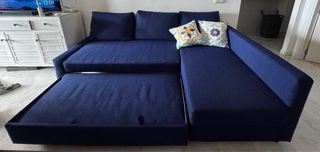Sofá cama de tela en color azul, con dos cojines decorativos. Muy fácil de abrir y cerrar la cama. Es de muelle, muy comoda. También se levanta el chaiselong para guardar mantasd - Cojines incluidos (hay 4)