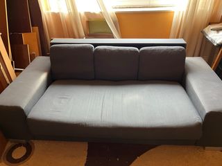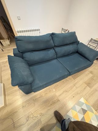 Vendo sofá cama de 3 plazas de Conforama, color azul grisáceo oscuro, diseño recto y actual. Tiene algo de uso pero está en bastantes buenas condiciones, lo único una tiene una mancha de humedad en uno de los reposabrazos (se ve en la foto) Características: • Sofá de 3 plazas • Convertible en cama de forma sencilla ( medidas de la cama 135x190cm) • Asientos y respaldo firmes • Brazos anchos y cómodos • Estética moderna, fácil de encajar en cualquier salón Recogida en mano en Oviedo en un 3º sin ascensor.