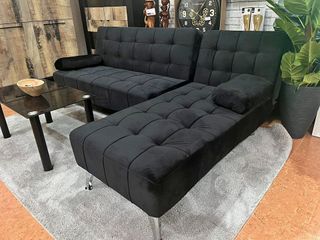 Sofá cama chaise longue modelo Elsa, ideal para tu salón. Su diseño moderno y elegante se adapta a cualquier espacio. - Tapicería de terciopelo. - Color negro. - Estructura robusta.