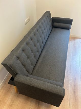 Vendo sofá de 3 plazas, tapizado en tela de color gris ocuro. En excelente estado. - Estilo nórdico, moderno y con las patas de madera. -Respaldo capitoné y brazos rectos con cojines cilíndricos incluidos. -El respaldo se puede abatir, quedando tipo sofá-cama ocasional. -Muy cómodo y firme. -Ideal para salón, despacho o apartamento. *Precio negociable.