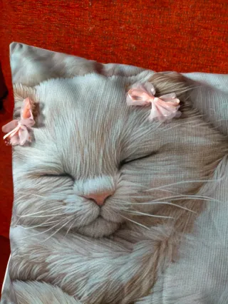 Funda de cojín con un adorable diseño de gato dormido. Ideal para añadir un toque tierno a tu sofá o cama. - Medidas: 45 x 45 cm. - Cierre de cremallera. - Adornos de lazo en los laterales.