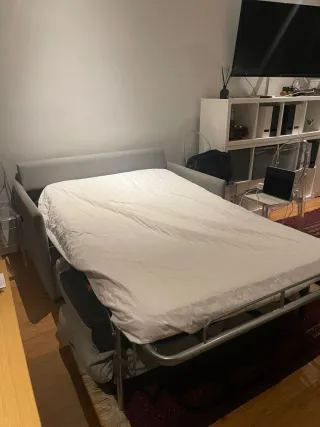Sofá cama de 140 cm en color gris. Un mueble práctico y elegante para tu hogar. - Tapizado en tela. - Diseño moderno. En buen estado y de muy buena calidad. Tiene alguna mancha del uso pero es probable quitarla. Medidas cerrado: - 95cm de fondo - 140cm de ancho Medidas abierto: - 204 cm de largo - 140 cm de ancho Seria recoger en el centro de Madrid, por plaza de Neptuno