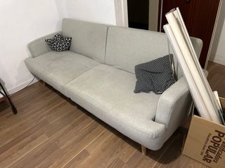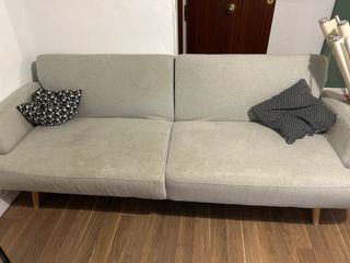 Sofá cama de tres plazas de Ikea. - Tapicería de tela. - Color grisáceo. - Almacenaje En perfectas condiciones. Se incluyen si se desean dos almohadas para la cama y ropa de cama si se desea.