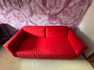 Este sofá se transforma rápida y cómodamente en una cama doble. Es fácil de mantener impecable, porque las fundas de colchón y del sofá se quitan y lavan. Puedes alternar distintas fundas para variar el estilo del sofá y se compran en Ikea. El precio actual del sofá en Ikea es de 400€. Este es de segunda mano y por eso el precio. La funda tiene varias manchas amarillentas que por lo menos yo, no he conseguido quitar. De resto esta en perfecto estado.