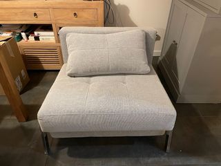 Este sofá cama individual es una pieza versátil y moderna para cualquier espacio. Usado sólo dos veces como cama. - Diseño compacto con unas medidas de 95 cm ancho x 100 cm fondo x 70 cm alto. - Medidas modo cama: 95 cm ancho x 210 cm fondo x 40 cm alto - Estructura metálica brillante. - Tapicería de tela en tono gris.