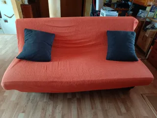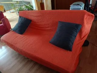 Sofá cama de Ikea. Muy versátil y funcional. La tapiceria tiene algunas manchas (se muestran en las fotos) que sinceramnete no hemos intentado sacar por falta de tiempo, pero si no salieran y quisieras cambiarla, hay tiendas externas a Ikea que venden el tapiz para este modelo en colores tendencia de temporada. La segunda y tercera foto son referencia del modelo, no es exacto pero muy similar.