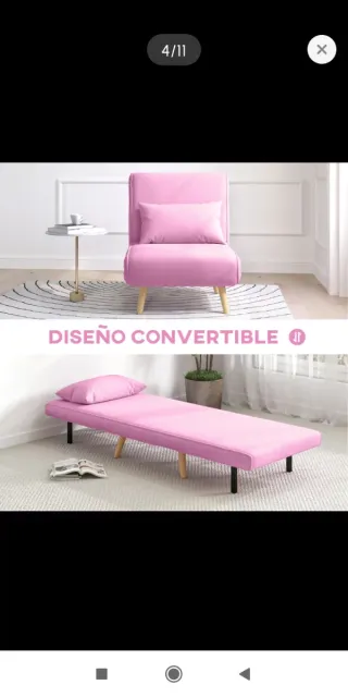 🔴 PRODUCTO NUEVO 🔴 Sofá cama individual de color rosa, perfecto para espacios pequeños o como asiento adicional. Su diseño convertible permite adaptarlo a diferentes necesidades. - Tapizado en tela. - Patas de madera.
