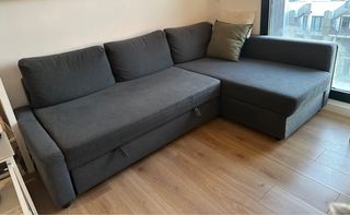 Sofá cama FRIHETEN de IKEA en buen estado, esquinero; con chaise longue y espacio de almacenaje. El chaiselongue puede montarse tanto en el lado derecho como en el izquierdo.