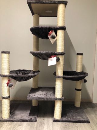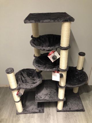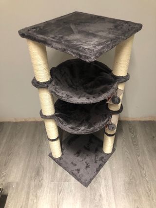 Se vende torre de 4 camas-hamacas con postes rascadores de fibra yute para gatos,totalmente nuevo. Color gris. Hamaca para gatos elevada con doble poste de rascado. La hamaca de felpa proporciona un espacio cómodo para que tu gato se relaje. Ayude a evitar que tu gato dañe alfombras, sofas, muebles, cortinas,etc. Los postes de fibra de yute natural ayudan a mantener las uñas sanas. Los tonos de color neutro se adaptan a la decoracion de tu hogar. Fabricación duradera de primera calidad Medidas ancho 99cm, alto 125cm, profundo 40cm
