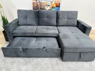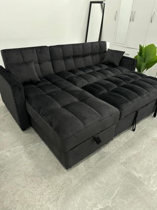 Sofá cama de 215cm de largo en color negro. Su diseño moderno y funcional lo hace ideal para cualquier espacio. - Tapizado suave y agradable al tacto. - Estructura robusta y duradera. - Amplio espacio de almacenamiento integrado.