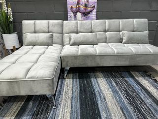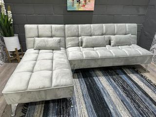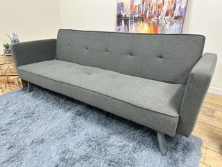 Sofá cama de 195cm de largo, con un diseño moderno y funcional. Patas cromadas y resistentes - Tapicería antimanchas. - Patas metálicas resistentes. - Respaldo y asiento con botones decorativos.