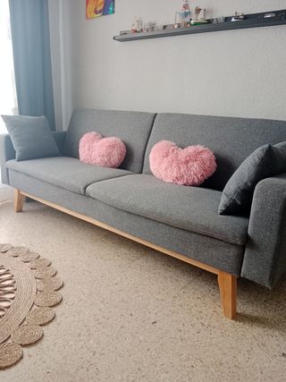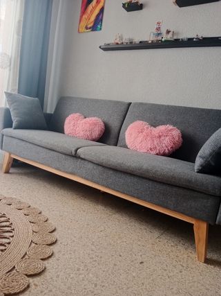 Sofá cama de tres plazas con un diseño moderno y funcional. - Tapicería de tela. - Estructura de madera. - Cojines decorativos a juego. *No me encargo de su carga.