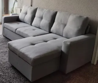 Sofá cama con chaise longue y arcón elevable. - Tapizado en tela. - Color gris. El sofá tiene 1 año, su precio original es de 399€, poco uso. Tiene una pequeña mancha de pegamento en el chaise longe que habría que reparar o poner una funda, de ahí el precio.