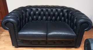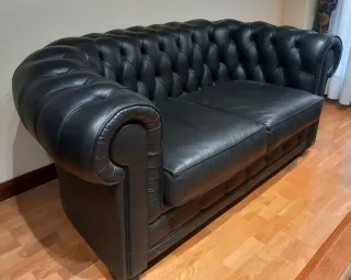 Perfecto estado de conservación. Sofá Chester vintage de piel de color negro (2 plazas) procedente de la sala señorial de notaría de estilo clásico. Sólo recogida