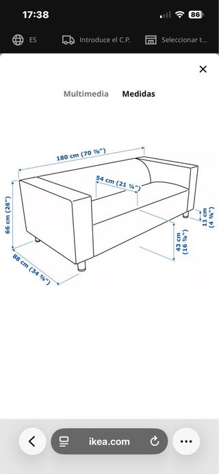 Sofá de dos plazas de Ikea con un diseño moderno y líneas rectas. Sus dimensiones lo hacen ideal para espacios de tamaño medio. - Ancho total: 180 cm (70 %). - Profundidad total: 88 cm (34 %). - Altura total: 66 cm (26). - Altura del asiento: 43 cm (16 %). - Profundidad del asiento: 54 cm (21 ¼). - Altura de las patas: 11 cm (4 %).