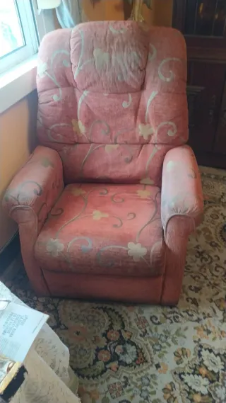 Este sofá de dos plazas presenta un diseño elegante con un estampado floral en tonos dorados sobre un fondo rojo. Sillon abatible, un poco deteriorada la tapicería por el uso, pero el mecanismo funciona bien - Tapicería de tela. - Estructura de madera. En persona, no sé envia