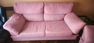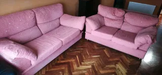 Conjunto de dos sofás de 3 plazas en color rosa. Son cómodos y tienen un diseño clásico. - Tapicería de tela. - Dos unidades disponibles.