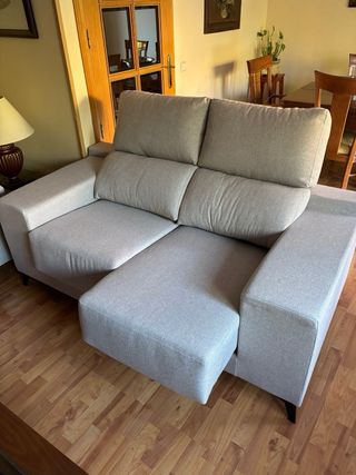 Sofá chaiselongue de 3 plazas con un diseño moderno y confortable. Tapizado en tela de alta calidad. - Patas de madera. - Cojines decorativos no incluidos Nuevo, tiene 2 años. El chaiselongue es bastante grande y caben dos personas tumbadas.