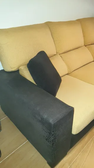 Sofá de cuatro plazas con un diseño moderno y cómodo. Combina tonos amarillos y chocolate para un estilo elegante. - Tapicería de tela. - Dos cojines decorativos incluidos. Tenemos gato y de cachorro lo arañó en alguna zona.