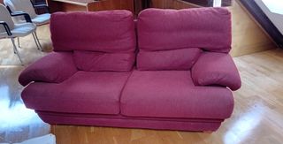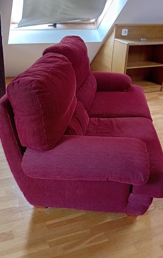 Se vende sofá de 2 plazas en color rosa/rojo y tejido de pana. Desenfundable. Está en buen estado aunque ha sido usado. NO tiene roturas ni manchas, NO está desfondado y la tapicería está usada pero en buen estado. La estructura es firme y no está rota. REGALO el sofá de 3 plazas del mismo conjunto, que ha sido más usado. Tiene una rotura en la tapicería (ver foto). Su estructura también es firme y no está deteriorada. Medidas sofá 2 plazas : largo 185, ancho 100 y alto 90 cms. Sofá de 3 plazas: largo 212, ancho 100 y alto 90 cms SE PUEDEN VER O RECOGER EN ARANJUEZ LOS DÍAS 18 Y 19 DE ENERO