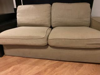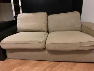 Sofá de dos plazas en buen estado. Tapizado de tela color beige. Personalmente creo que es muy comodo. Tiene una mancha en el reposabrazos. Probablemente se pueda quitar con la vaporeta pero yo no tengo Se vende por mudanza. Se encuentra en Badalona (L2 Pompeu Fabra)