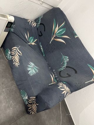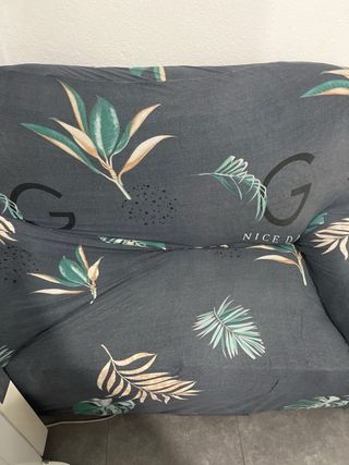 Sofá de dos plazas con un diseño moderno y llamativo. - Funda con estampado de hojas tropicales en tonos verdes y beige. - Tejido suave y resistente. Lo regalo si alguien lo quiere Ahy que poner un relleno nuevo donde te sientas