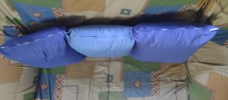 de Segunda mano pero en buen estado...con relleno de unos 10 cm de grosor y fundas con cremallera. Los 3 cojines llevaban tiempo en un armario...no son de uso reciente. Quedan bien los 3 cojines por longitud en un sofá de dos plazas,aunque obviamente pueden valer para sillas,sillones,etc... o para tener el pie en alto por alguna recomendación médica. Las medidas aproximadas son 32 x 32 cm cada uno. 2 con la funda en azul oscuro y la otra en azul más claro.