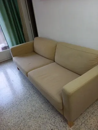 Sofá de tela 3 plazas, en dos módulos. Ideal para piso estudiantes. Recomendamos poner funda para que quede fantástico! Color beige.