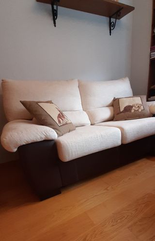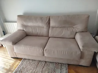 Conjunto de sofás de 2 y 3 plazas en excelente estado. - Tapicería en chenilla color beige que repele líquidos y manchas. Totalmente desenfundable para su lavado en la lavadora. - Base y estructura en polipiel marrón oscuro lo que facilita su limpieza y duración. - Asientos fabricados con material de alta densidad que aumentan su durabilidad y hace que estén y sean firmes a la vez que cómodos. Medidas: Sofa 3 plazas ( 215 cm largo x 105 cm fondo x 95 cm alto) Sofa de 2 plazas ( 170 cm x 105 cm x 95 cm alto) El precio del conjunto 3 + 2 es de 260€, si se desea sólo uno de los 2 sofas, su precio es de 160€ cada uno.