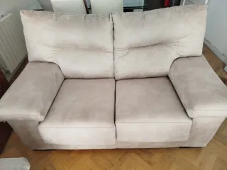 Sofá de dos plazas, está en buen estado, lleva guardado 6 años, se desenfunda todo para lavarse la tapicería está muy bien no está desgastada. - Tapicería de tela. - Color beige Recoger en san Fernando de Henares.
