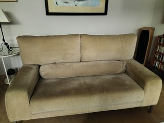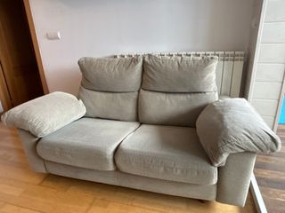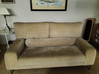 Sofá de dos plazas en color beige, de tela. Es un sofá cómodo y acogedor, ideal para una pequeña sala de estar. por falta de espacio Comodo - Perfecto estado. - Diseño clásico.