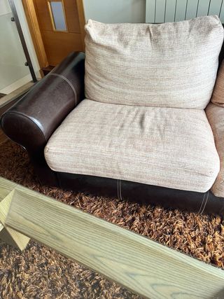 Cómodos sofás de dos plazas y tres plazas. - Tapicería de tela chenilla y el armazón en cuero marrón claro. El de 3 plazas tiene alguna mancha que se quita ha sido en la mudanza. El precio es por la pareja. Las medidas exactas están en la descripción.