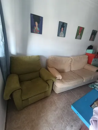 Conjunto de sofá siesta y sofá de dos plazas. Los dos por 30€ por separado 15€ cada uno - Sofá siesta en color verde. Medidas ancho: 97cm alto 95cm abierto largo 100cm - Sofá de dos plazas en color beige. Medidas indicadas - Tapicería de tela.